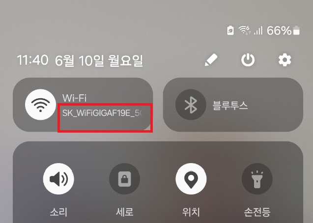 스마트폰 화면을 맨 위로부터 아래로 스크롤해서(잡아 내려서), 아래 빨간 박스의 와이파이 아이콘을 찾습니다. 그다음 1초 이상 길게 꾸욱 눌러주세요.