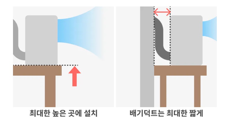 높은 위치에 설치, 덕트는 최대한 짧게 설치