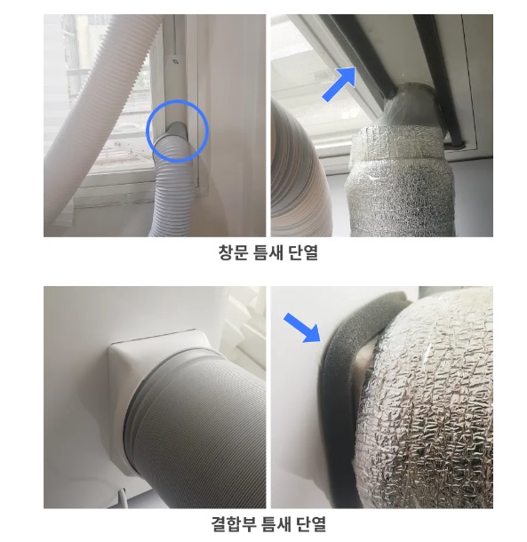 1) 설치용 슬라이드와 2) 덕트 결합부의 틈새를 문풍지, 테이프 등으로 막아줘야 합니다.
